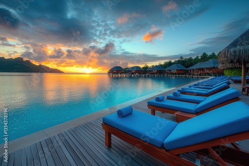 A serene tropical scene featuring blue loungers by a tranquil infinity pool at sunset, framed by lush greenery and distant mountains.