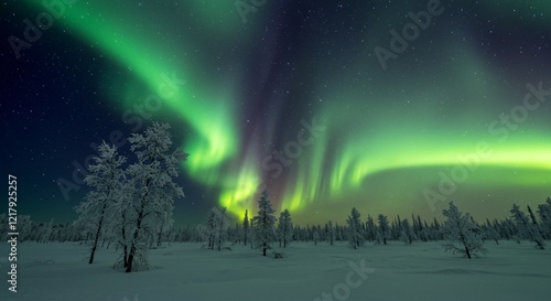 A serene tundra landscape with frost-covered trees shimmering under the aurora borealis