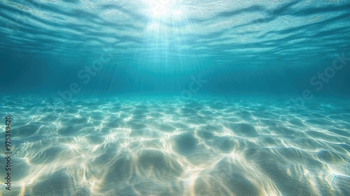 A serene underwater scene of a sandy seabed, with clear tropical ocean water above and sunlight creating shimmering ripples.