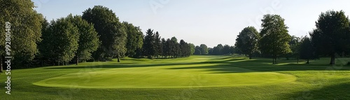 A serene view of a beautifully maintained golf course with lush green fairways and surrounding trees under a clear sky