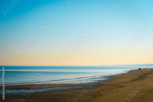 beach, sunrise, sand, clear sky, tranquil, morning, shoreline, horizon, blue skies, sea, seascape, peaceful, nature, outdoors, idylli, scenic, walking, solitude, vacation, summer, leisure, travel, dawn, ocean view, relaxation, serene, golden hour, scenic view, early morning, atmospheric