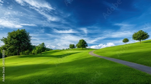 nature, view, hill, blue, sky, serene, lush, green, cloud, path, beauty, calmness, landscape, scenery, exploration, peaceful, sunlight, relaxation, fresh, tree, meandering, trail, grassy, field, recreation, hiking, countryside, vibrant, colours, pattern, summer, idylli, air, scenic, vegetation, environmental, open, space, rural, area, rich, bright, activity, zen