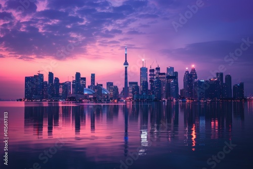 A serene view of the Toronto skyline at twilight, with the city lights reflecting on the calm water, Serene city skyline at twilight, with the last remnants of daylight fading in the horizon
