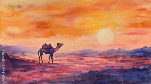A serene watercolor of a camel crossing a desert under a vivid sunset with warm tones