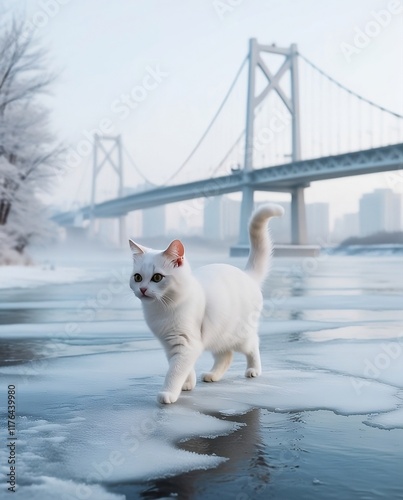 A serene white cat the winter landscape is bathed in a soft, pale blue light, with the frosty air misting up from the river's surface, adding to the tranquil atmosphere.