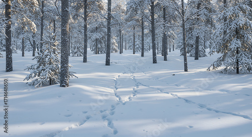 winter, snow, forest, tree, pine tree, evergreen tree, frost, glacé, cold, white, serene, tranquil, peaceful, wilderness, nature, natural beauty, pristine, footprint, track, path, trail, footstep, hiking, walking, adventure, journey, exploration, sunlight, sun ray, light, shadow, crisp, bright, morning, day, outdoors, environment, season, wood, bark, branch, conifer, scenic, picturesque, idylli, untouched