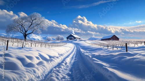 winter, landscape, snow, serene, cover, field, clear, blue, sky, tree, picture, season, vinery, warmth, rural, vista, white, pristine, wildlife, gleam, ice, nature, air, sunlight, stillness, fresh, blanket, calm, farmhouse