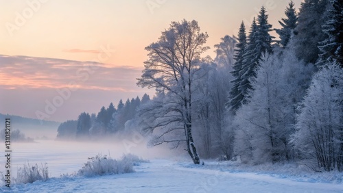 A serene winter landscape featuring snow-covered trees, a misty atmosphere, and a soft pastel sky at dawn.