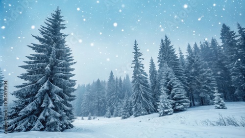 A serene winter landscape showcasing snow-laden evergreen trees under a softly falling snow, creating a picturesque and peaceful scene.