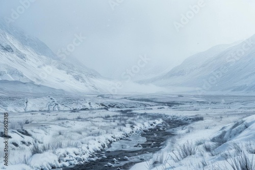 snow, vale, river, mountain, cold, winter, landscape, nature, fog, ice, terrain, wilderness, calmness, scenery, coldness, weather, environment, silence, beauty, exploration, adventure, remote, peaceful, white, sky, cloud, frost, stream, rock, grass, elevation, view, horizon, solitude, calm, natural, scenic, pristine, fresh, breathtaking, wild, photo, travel, journey