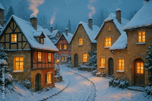 A serene winter night in a quaint village, where snow-covered roofs glow with warmth from the windows of cozy cottages