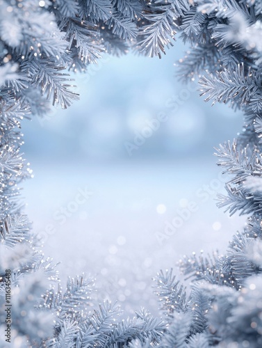 A serene winter scene framed by frosty branches, creating a tranquil atmosphere with a soft focus on a snowy background.