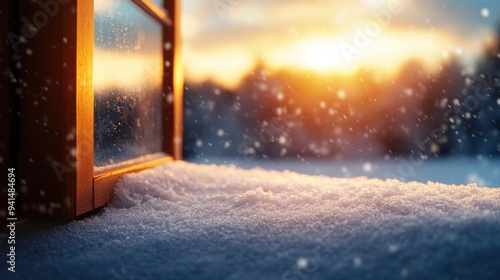A serene winter scene showing a wooden window with snow-covered ground and a beautiful sunset in the background.