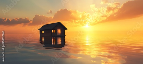 A serene wooden boathouse gently floats on tranquil waters at sunset, with golden reflections and sky space