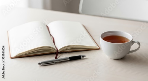 A serene workspace with a notebook, pen, and tea cup on a white table, suggesting a moment of contemplation or study.
