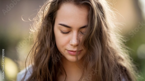 A serene young woman with long brown hair, softly gazing down, surrounded by natural light.