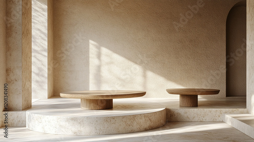 A series of evenly spaced geometric shapes in neutral tones on a plain background representing order, balance, and harmony with minimalistic bright tones and blurred empty space for emphasis