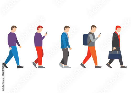 people, walking, vector, illustration, flat, design, movement, sequence, man, casual attire, business, urban, city, individual, progress, journey, lifestyle, modern, graphic, digital, simple, minimalist, abstract, figure, silhouette, fashion, clothing, purple, blue, orange, black, suit, backpack, technology, phone, mobile, device, briefcase, commuting, pedestrian, sideview, animation, art, style, isolated, white background, dynamic, forward