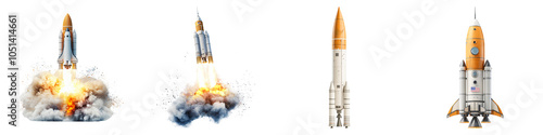 A series of four rockets depicting different stages of launch, showcasing fire, smoke, and ascent into space against a white background.