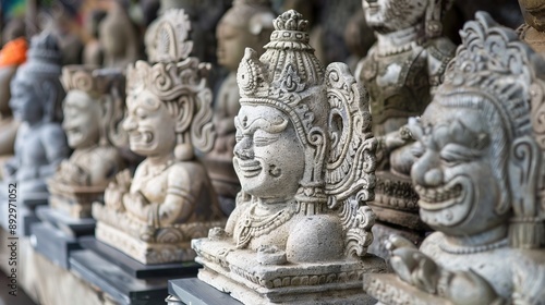 A series of intricately carved stone statues of varying expressions, showcasing traditional craftsmanship and artistic heritage in an outdoor setup filled with artifacts.