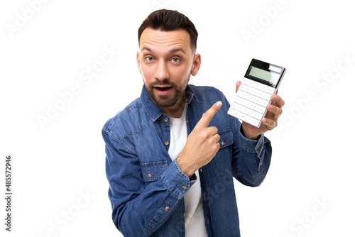 a serious middle-aged man with a beard showing a calculator screen pointing at it with his finger with his mouth parted indignantly