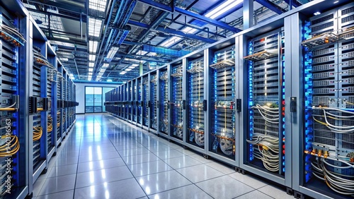 A server room with racks of computers and cables, technology, data center, networking, hardware, equipment