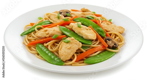 A serving of lo mein noodles with vegetables and chicken on a white surface
