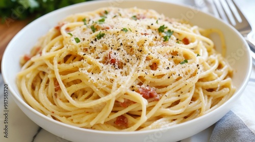 A serving of spaghetti carbonara with a generous topping of grated cheese and a sprinkle of black pepper, presented in a white ceramic bowl with a fork on the side.
