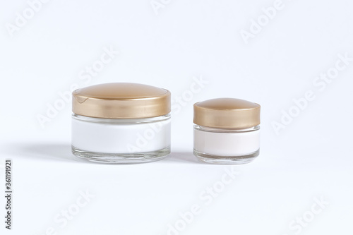 A set for skin care around the eyes and skin consisting of glass jars with cream and serum.