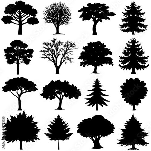 A set of 20 highly detailed silhouettes of trees in various shapes