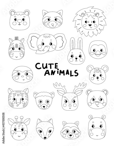 line, animal, face, cute, outline, doodle, head, fox, simple, set, tiger, lemur, mouse, hippo, red panda, animal, art, baby, background, bear, cartoon, character, childish, children, clip art, collection, colouring, cervid, design, drawing, fun, funny, graphic, happy, icon, illustration, isolated, lion, logotype, panda, raccoon, vignetting, sloth, vector, white, zebra, zoo