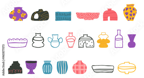 A set of bold, brightly hand-drawn flower vases isolated clip arts, various vases or vessels in a primitive naive style, vector illustration pack