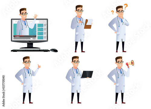 medicals, caucasian, apothecary, professional, character, different, communication, announcement, pose, collection, announce, dentist, laptop, coat, clinical, specialist, labcoat, loudspeaker, person, consultation, male, cyberspace, care, megaphone, isolated, medic, uniform, computer, design, physician, vector, man, hospital, human, stethoscope, health care, set, cartoon, health, monitor, medicine, people, doctor, help, attention, online, information, illustration, clinic