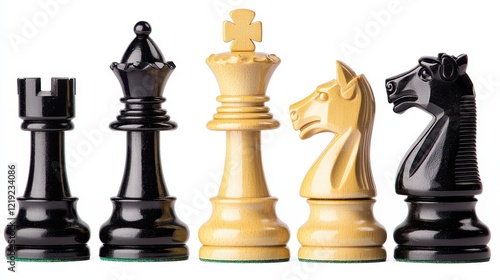 A set of classic chess pieces, with the king and queen in the front, on a white isolated background