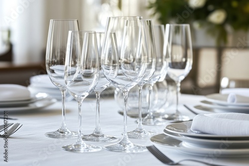 A set of crystal-clear glassware arranged neatly on a dining table, ready for a formal dinner, showcasing the simplicity and elegance of the glass, enhancing the dining experience.