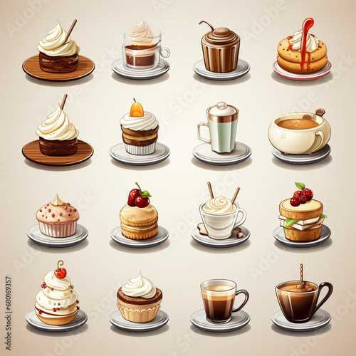 a set of detailed icons representing a variety of food and beverage items, from gourmet coffee to delectable pastries created with Generative Ai