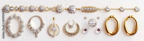 A set of elegant jewelry pieces, glittering with timeless beauty, isolated minimal with white background