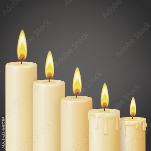 A set of five white pillar candles arranged in a descending height order from left to right against a dark gray transparent background.