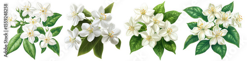 A set of four illustrations of white jasmine flowers and green leaves isolated on transparent background