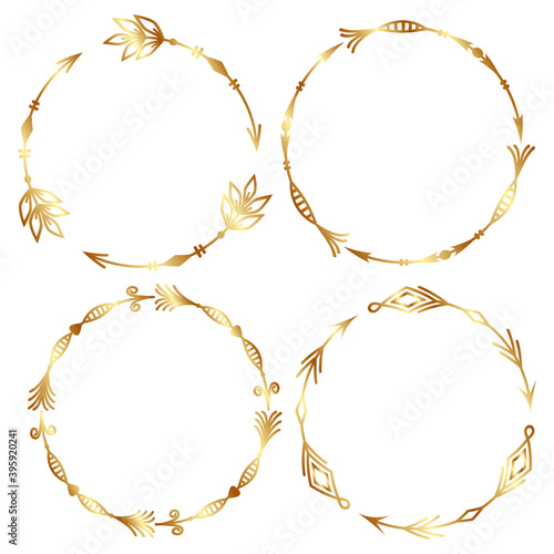 a set of four round isolated tribal patterned arrow frames made with a Golden outline outline, combined into a single outline, vector illustration.Design and decoration of greeting cards, clipart, scr