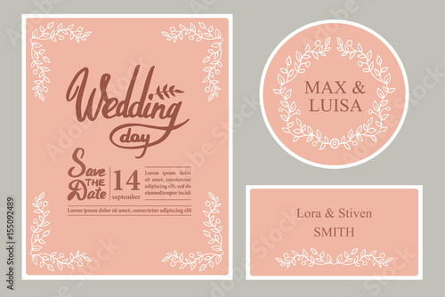 A set of graphic elements for the wedding on a pink background. Frames of leaflets. twigs. Invitation cards