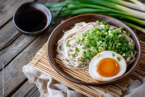 set, hand-made, soba, noodle, served, cold, bamboo, mat, dipping, sauce, finely, sliced, green, onion, side
