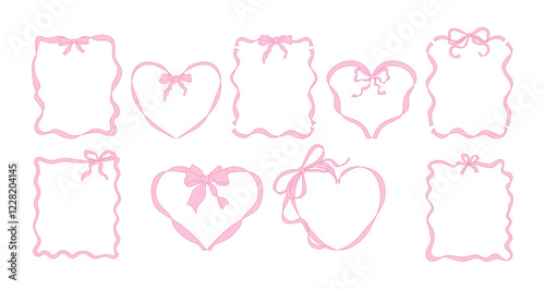 A set of heart-shaped and rectangular pink frames with delicate bows and ribbons. A hand-drawn coquette-style borders in minimalist line art for invitations, cards, posters, menus