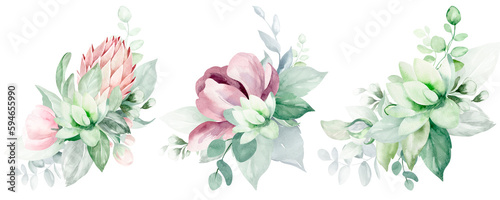 A set of illustrations of watercolor floral bouquet - gently pink, green, rose flower green leaf leaves branches of bouquets collection. Wedding stationery, congratulations, wallpaper, fashion, backgr