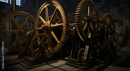 A set of mechanical gears and cogs in a vintage industrial setting, showcasing the intricate design and movement of machinery.