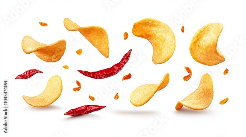 A set of potato chips with red paprika seasoning, floating in the air, isolated on a white background