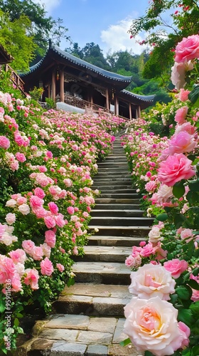 set, stair, leading, up, pagoda, surrounded, pink, rose, beautiful, flower, path, garden, lead, rose, stair, temple, traditional, japanese, made, stone, white, full, bloom, creating, stunning, display, colours, texture, wood, blue, roof, intricate, carving, pillar, sky, tree, bush, surrounding, background, more, shrub, natural, beauty, scene, atmosphere, peaceful, serene
