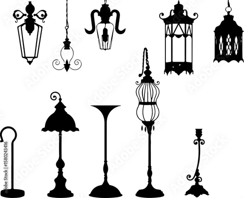 decoration, vector, illustration, pattern, design, silhouette, art, christmas, lamp, jewellery, light, lantern, black, chandelier, fashion, antique, set, ornament, vintage, shape, street, symbol, retro, old, icon