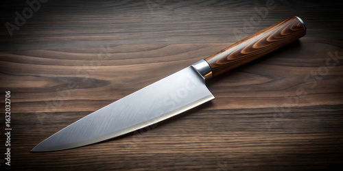 knife, kitchen, cook, chef, blade, steel, sharp, cut, slice, food, prepare, ingredient, tool, equipment, handle, wood, grain, surface, table, dark, closeup, macro, detail, professional, culinary, epicure, cooking, kitchen utensile, utensil, instrument, metal, shiny, polished, sharpness, precision, craft, artisan, hand-made, design, modern, elegant, simple, clean, minimalist, sharpened, depth, eatery