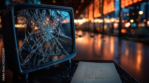 television, shattered, note, city, light, vintage, broken, table, urban, ambience, nostalgia, retro, design, decor, interior, art, photo, still life, night, aesthetic, creative, mood, scene, detail, atmosphere, visual, storytelling, texture, contrast, colours, composition, sharpened, depth, perspective, quiet, calm, memory, antique, modern, artistic, unique, light, shadow, stillness, beauty, simplicity, expression